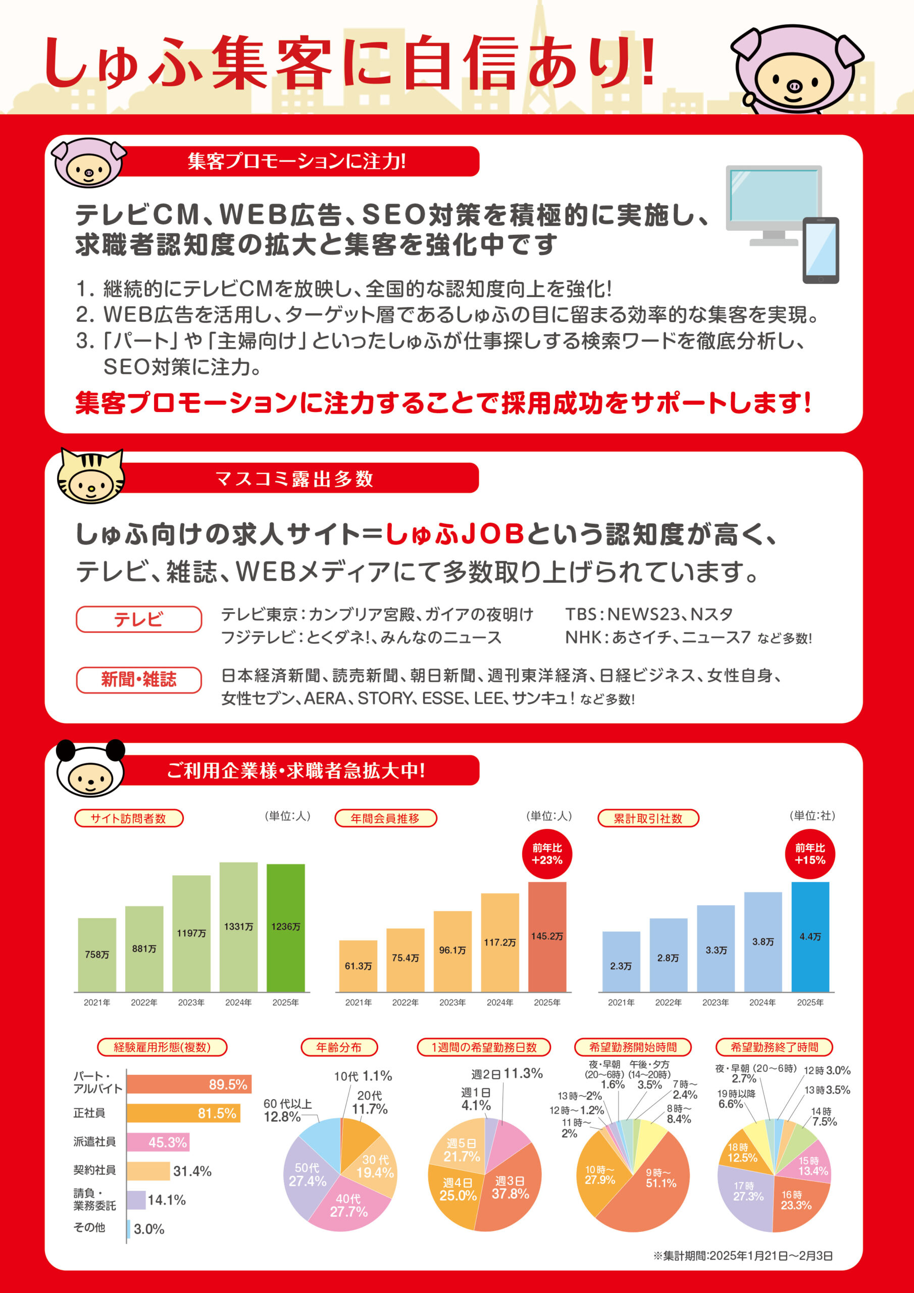 年間訪問者数1331万人で登録会員数は117.2万人。正社員経験のあるしゅふが約80%となっております。